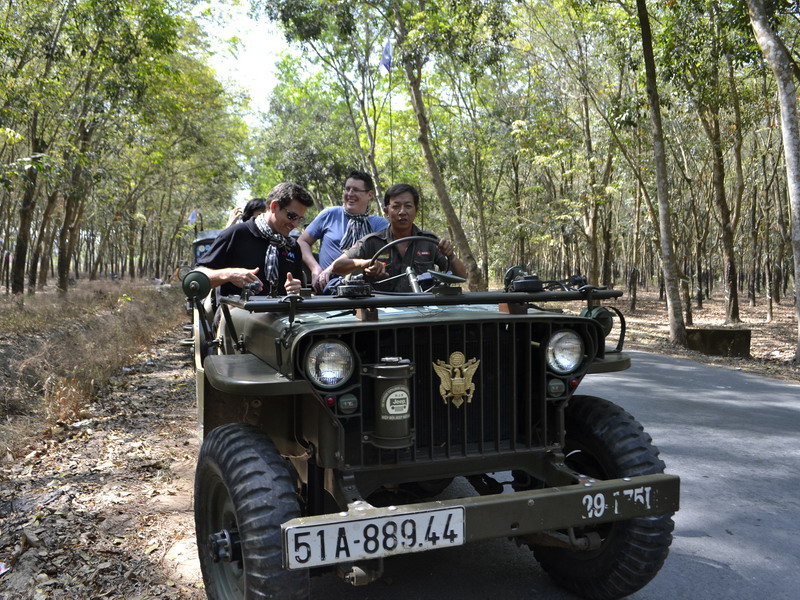• 8 Am: Departure from Saigon center by Army Jeep, then take a drive for 2 hours to Cu Chi Tunnels. After the first hour, you will turn into small roads running through towns, schools, markets, rubber farms.