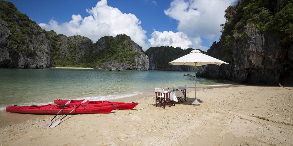 Dragon Pearl Cruise’s itineraries: Two days one night, three days two nights on cruise to untouched Bai Tu Long Bay on one of the boutique traditional boats of Indochina Junk, this is ideal for you to discover the natural beauty and local life in a limited time schedule, you will get to visit a cave, go kayaking and visit a floating village. This trip takes you deep into natural wonder and experience a memorable night in the majestic bay. The route is off the beaten track and our staffs are keen on taking care of customer’s request, it is quite potential to be your highlight trip in Vietnam. The highlight of Dragon Pearl Junk Cruise in Bai Tu Long Bay, the less visited part of Halong Bay, Traditional wooden boats and authentic experience, Oriental-designed cabin with large windows and en-suite bathroom, Explore Halong Bay by kayak, visit the cave and a bamboo boat trip to floating village, Authentic Vietnamese cuisines onboard.
