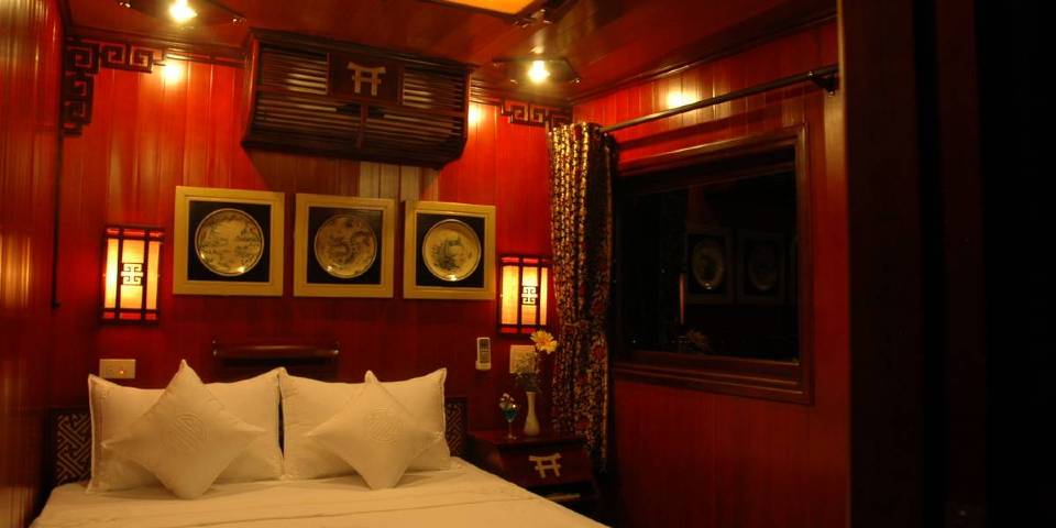 The boat features 11 cabins and 3 decks with both outside and inside dining areas. Each cabin is beautifully decorated in a traditional style and equipped with modern amenities for a comfortable stay. Large sea view windows allow you to enjoy the fantastic landscape outside, from the comfort of your room. The sundeck on top will be a great place to view the bay at sunset and have an enjoyable time with your friends. Email:dragonpearljunkcruise@impresstravel.com & call to Mr. Alex Impress Travel, Bai Tu Long Bay Tours, Bai Tu Long Bay Cruises & Starlight Cruise Manager at his cell-phone (+84) 9123 79 189 ​