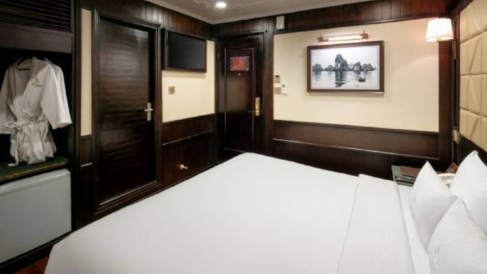 Following the luxury standards, each Pelican Cruise has 22 well-appointed cabins, a luxury bar & restaurant, and a spacious sundeck. In terms of accommodation, each cabin in Pelican cruise has been set in a perfect setting to meet various requirements. All cabins have a wide bow-window and a private balcony and feature wooden floor and hand-made furniture. Contemporary amenities such as Wi-Fi, air-conditioning, in-house telephone, private bathroom, hot and cold shower can be found in each cabin. In addition to modern facilities and advanced services, Pelican is one of the few Halong Bay cruises being fully equipped with sonars and radars. This is one of the safest cruises in Halong Bay that passengers can place their trust in.