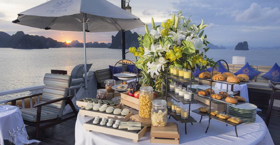 The finest luxury boutique 6-star cruise in Halong Bay. Born to make sure you get the finest treatment that you deserve, Hera makes a commitment on high-end customizable service for your ideal journey. Each of the 11 spacious suites with locally crafted wooden cabins on the vessel features a different narrative theme and décor, striking panoramas and world-class amenities. Our uniqueness is for those seeking for even more individualized attention and flexibility, experiencing butler service as well as personal chefs on the Concierge Level, enjoying organic and locally sourced ingredients for delectable meals served as you wish, and possessing 2 days trip tailored to your liking.