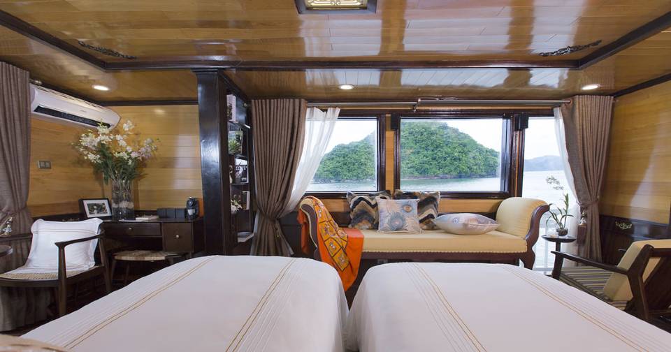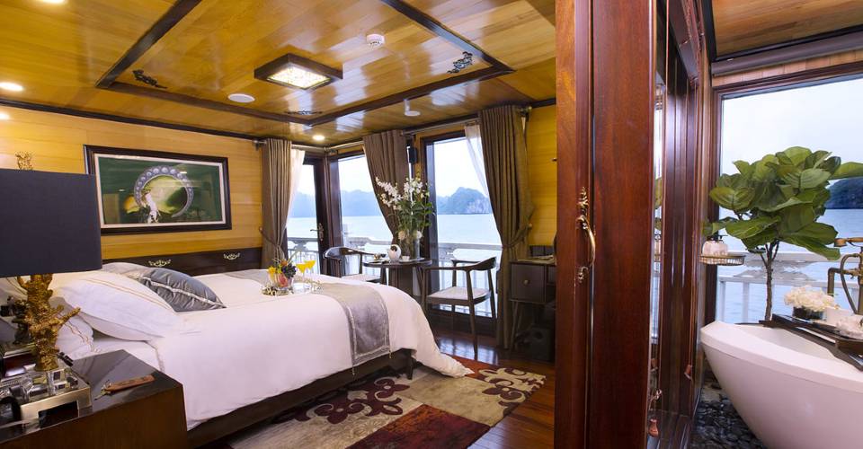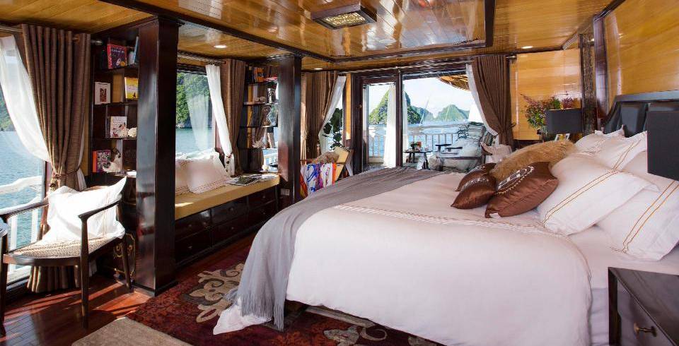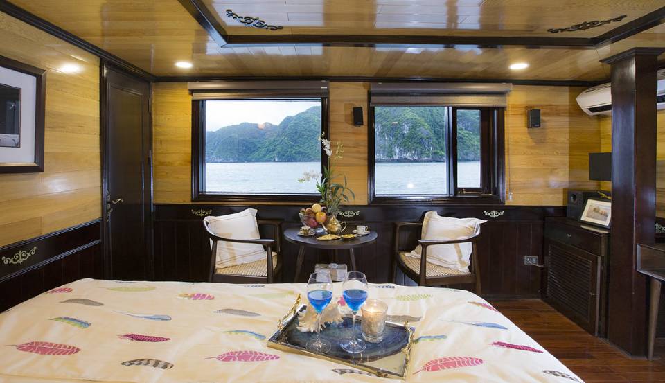 Hera Cruises features 11 spacious luxury cabin accommodation that provide the ultimate in intimacy and comfort for overnight cruises on Halong Bay. Redefining luxury as boutique wellness, our elegant accommodation allows for relaxation and discovery that is convenient for you. Whilst each suite has its own story and décor, all feature grand views that highlight the majesty of Halong Bay. Striking panoramas, world-class amenities, locally crafted wooden furnishings and plush linens create the ambience for a private cruise experience unlike any other. On the second deck, suites have all-glass windows that allow for full views of the bay to be enjoyed from your bed or bathtub with a glass of champagne.