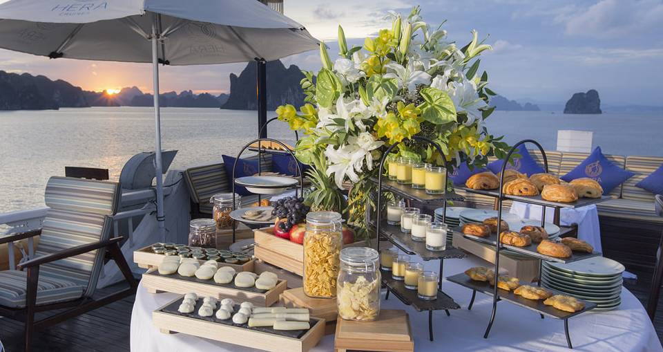 Hera Cruises features 11 spacious luxury cabin accommodation that provide the ultimate in intimacy and comfort for overnight cruises on Halong Bay. Redefining luxury as boutique wellness, our elegant accommodation allows for relaxation and discovery that is convenient for you. Whilst each suite has its own story and décor, all feature grand views that highlight the majesty of Halong Bay. Striking panoramas, world-class amenities, locally crafted wooden furnishings and plush linens create the ambience for a private cruise experience unlike any other. On the second deck, suites have all-glass windows that allow for full views of the bay to be enjoyed from your bed or bathtub with a glass of champagne.