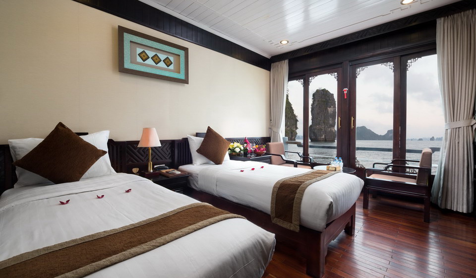 Located on the seconf floor with connecting rooms and panorama windows overlooked the sea, you can see and feel the real wonderful Halong Bay. This cabin is good choice for small group or family with children. You also have a free special offer as below: Fruits basket & Bottle of house wine.
